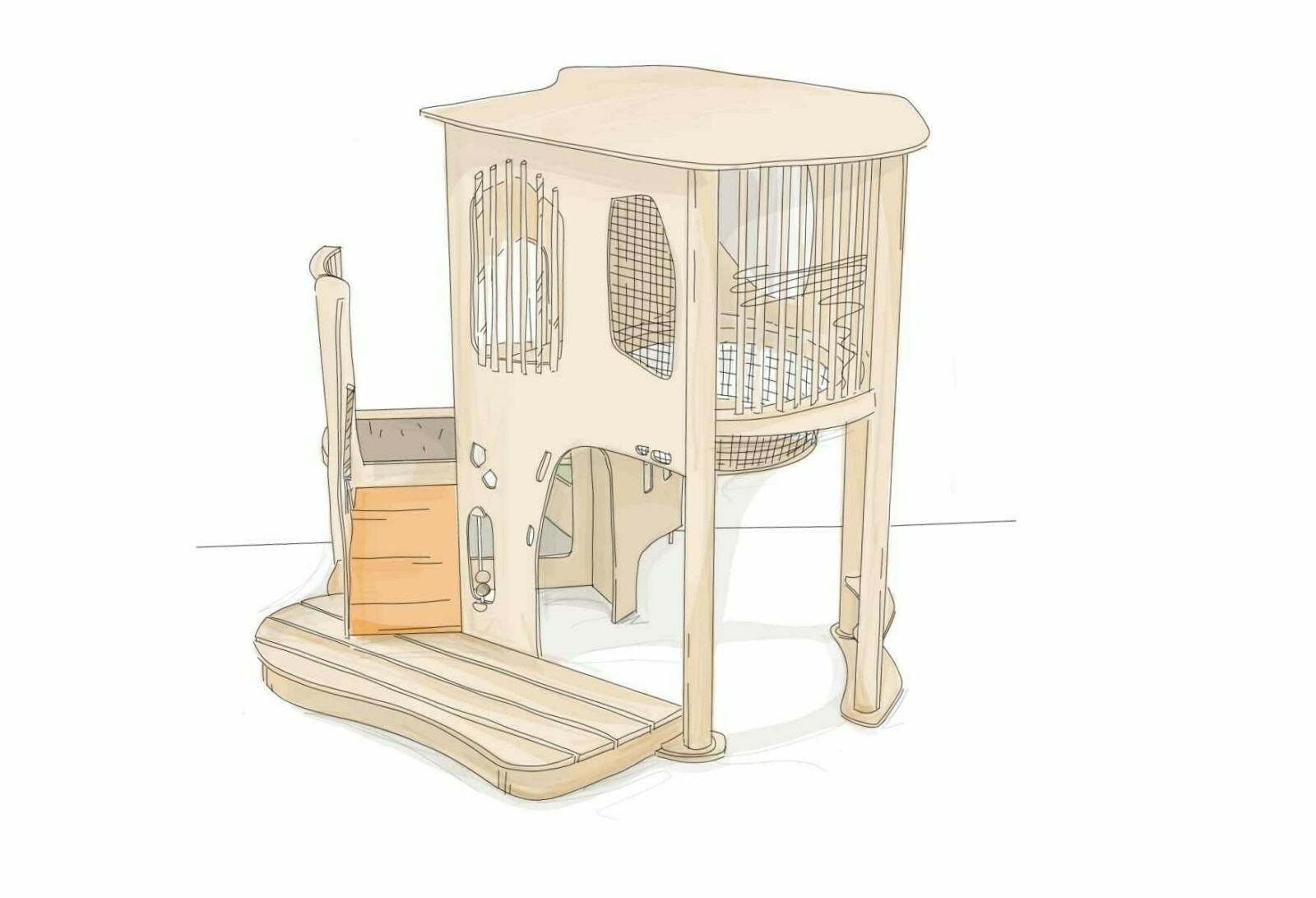 Der Aufstieg erfolgt über eine Teppichwelle und Stufen mit verschiedenen haptisch anregenden Belägen. Max bietet ein großes Stufenpodest mit Belag aus Vollholz und einen Kaminaufstieg.