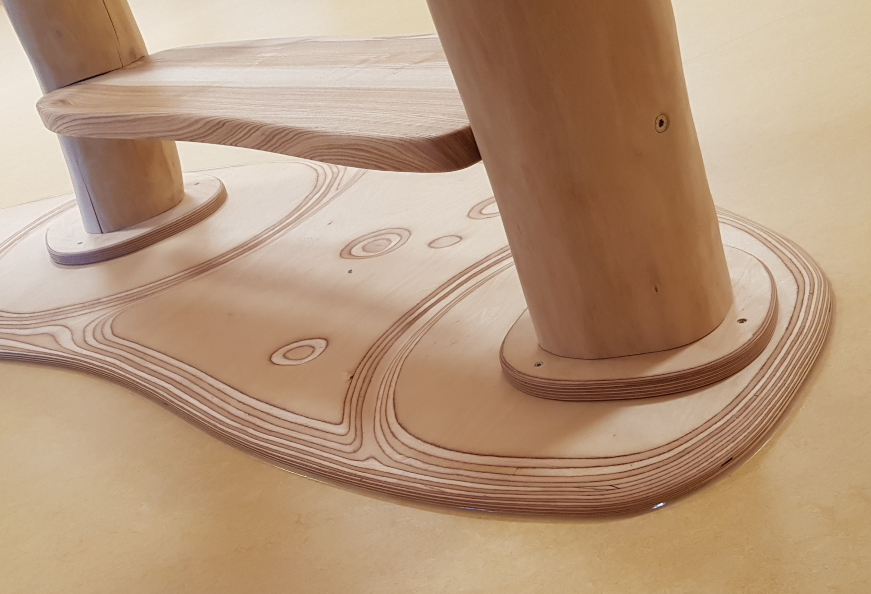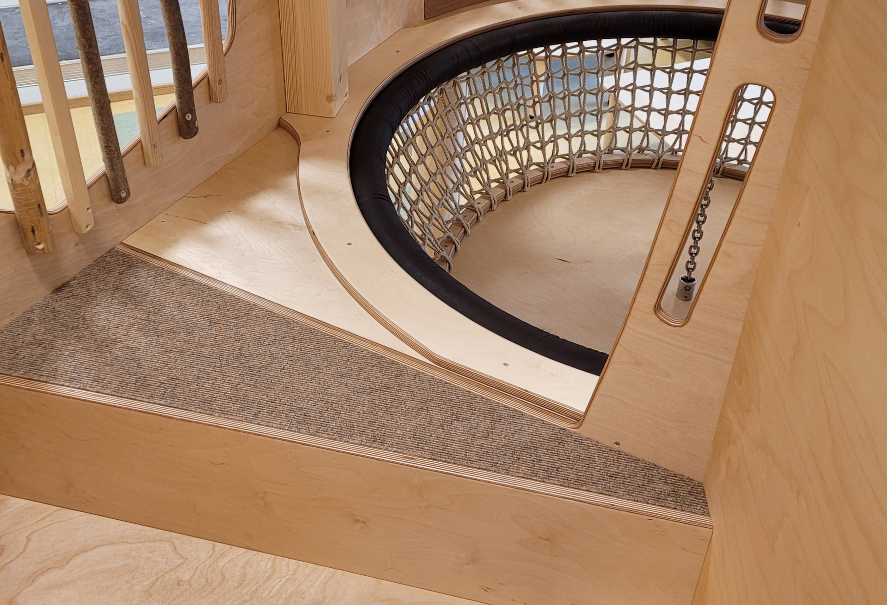 Der Aufstieg erfolgt über eine Teppichwelle und Stufen mit verschiedenen haptisch anregenden Belägen. Max bietet ein großes Stufenpodest mit Belag aus Vollholz und einen Kaminaufstieg.