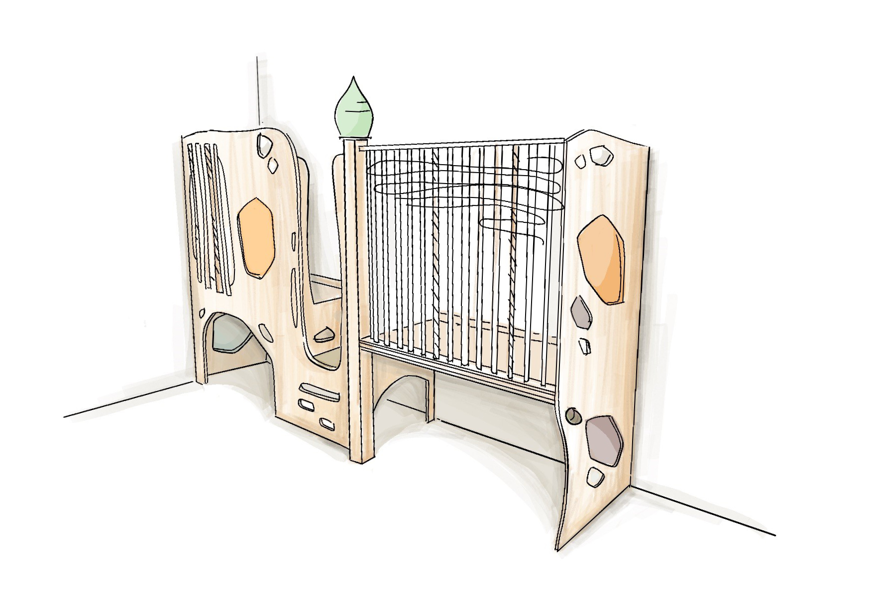 Das schmale Podest kann Rollenspiel- oder Baubereiche um Rückzugsorte ergänzen oder dient als Ausgangsort für Bewegungsanlässe.