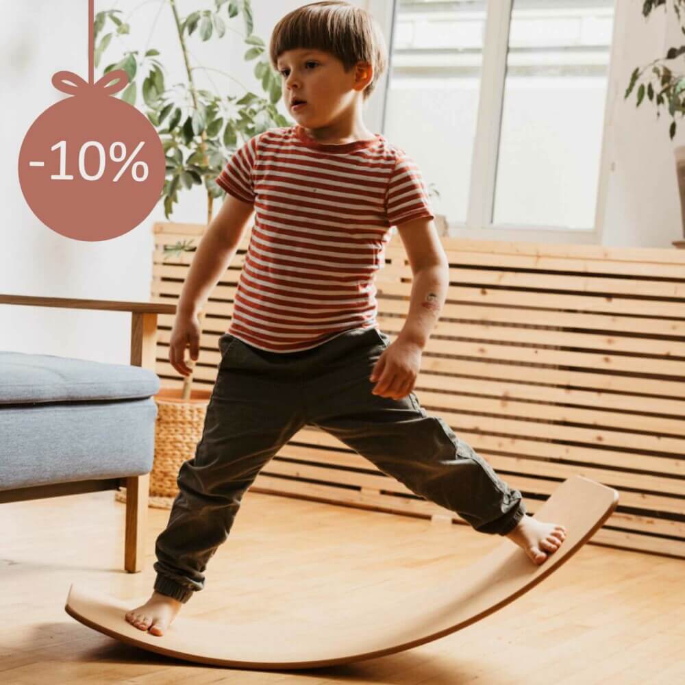 Kleinere Kinder balancieren im Stehen, kniend oder liegend, das klare, einfache Design des Balance Boards ermöglicht den vielseitigen Einsatz im kreativen Spiel.