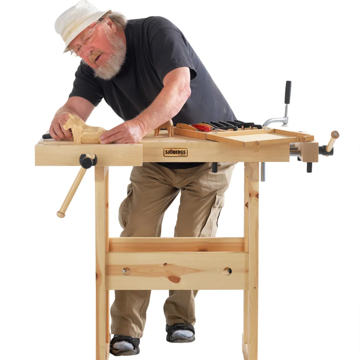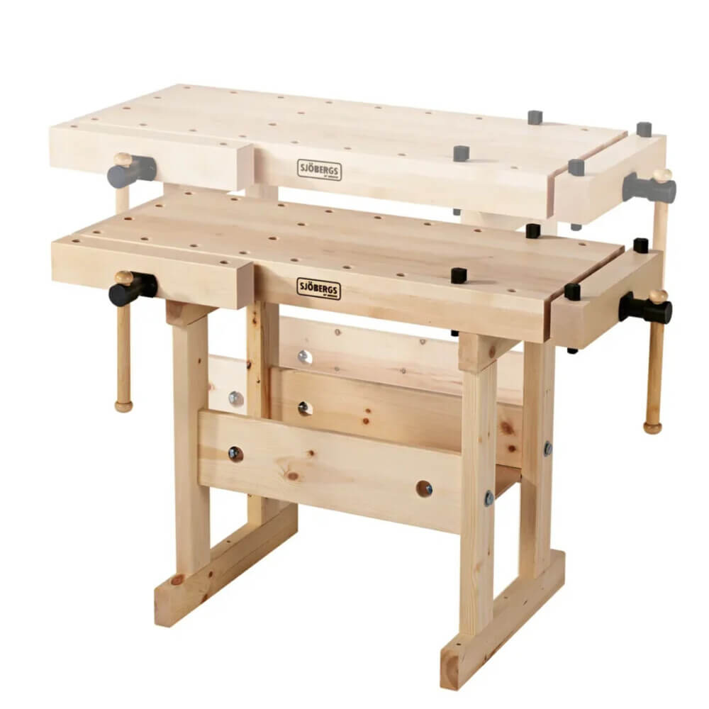 Diese Hobelbank wird mit zwei Beinpaaren in unterschiedlicher Arbeitshöhe (64 / 86 cm) geliefert, die sich schnell und unkompliziert auswechseln lassen und somit das “Mitwachsen” dieser Werkbank ermöglichen.