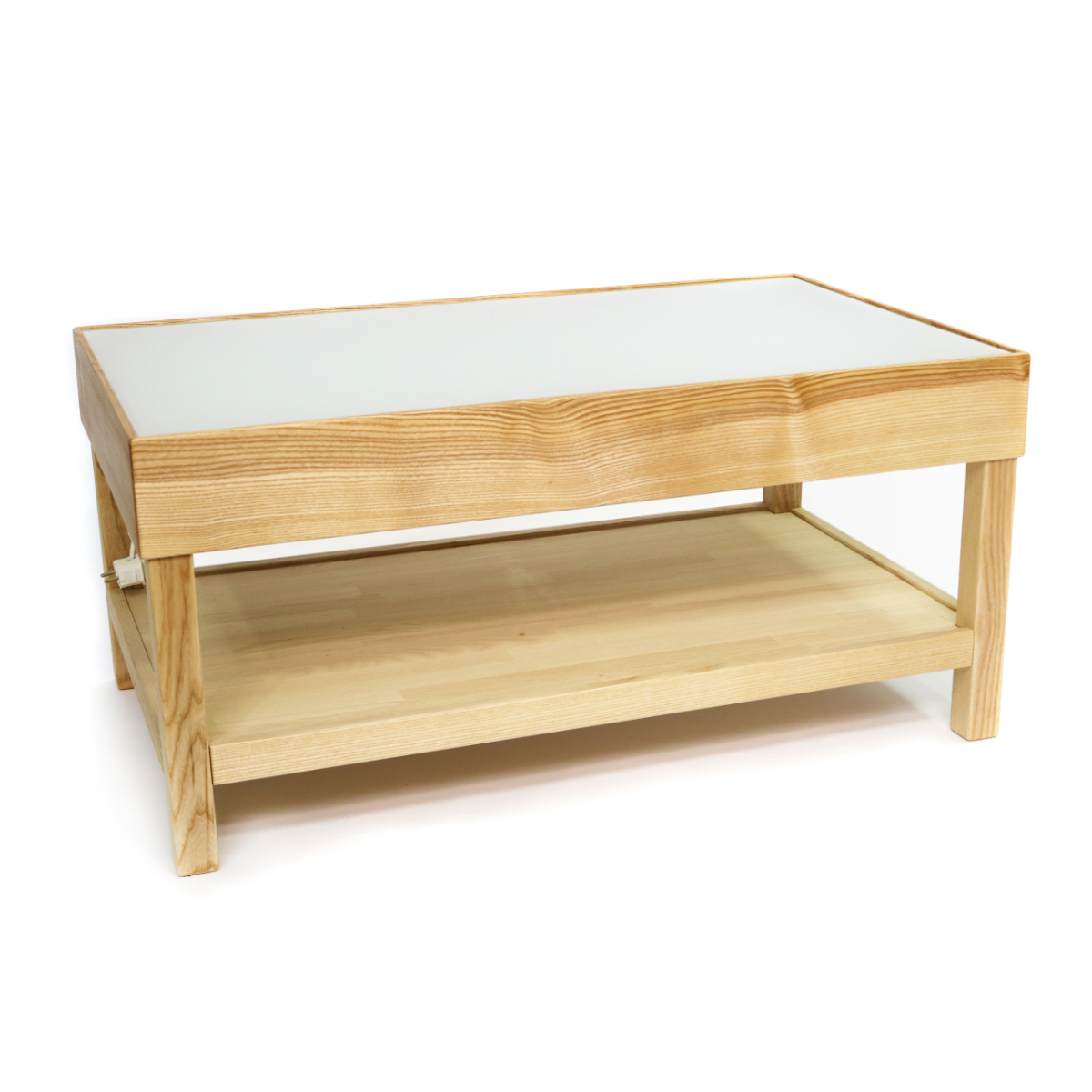 Bestandteile: Holzkonstruktion mit opaker Scheibe und Unterkasten für die Leuchten; inkl. Leuchtmittel und Netzstecker, unten eine Ablagefläche für Material