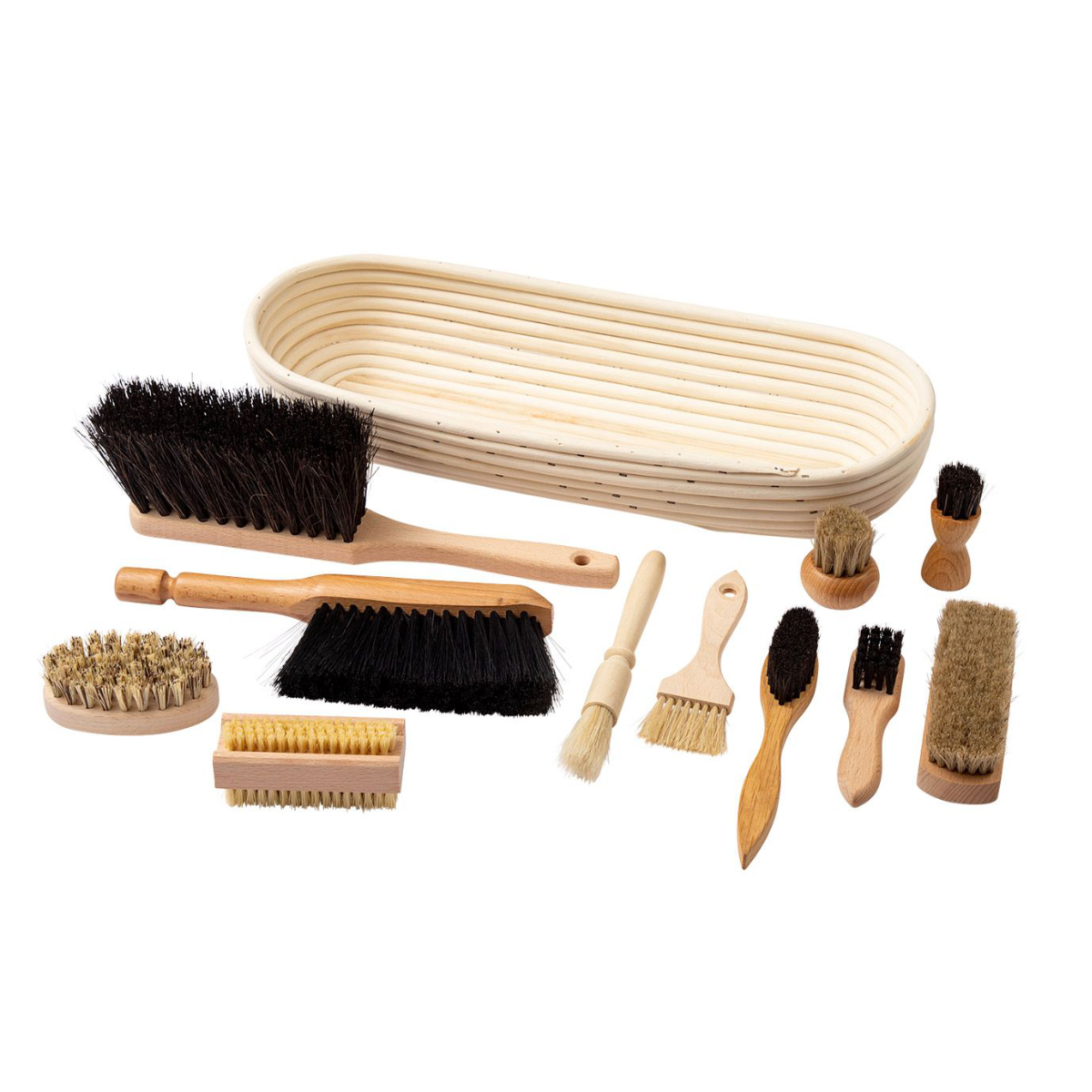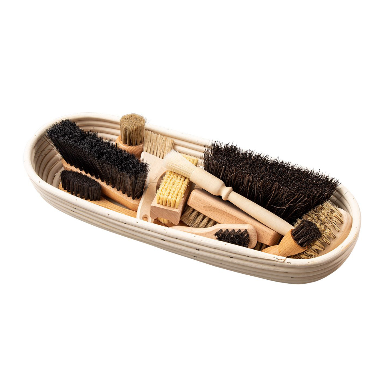 2 Handfeger, 7 Bürsten in unterschiedlichen Größen und Ausführungen, 2 Pinsel, 1 Aufbewahrungskorb