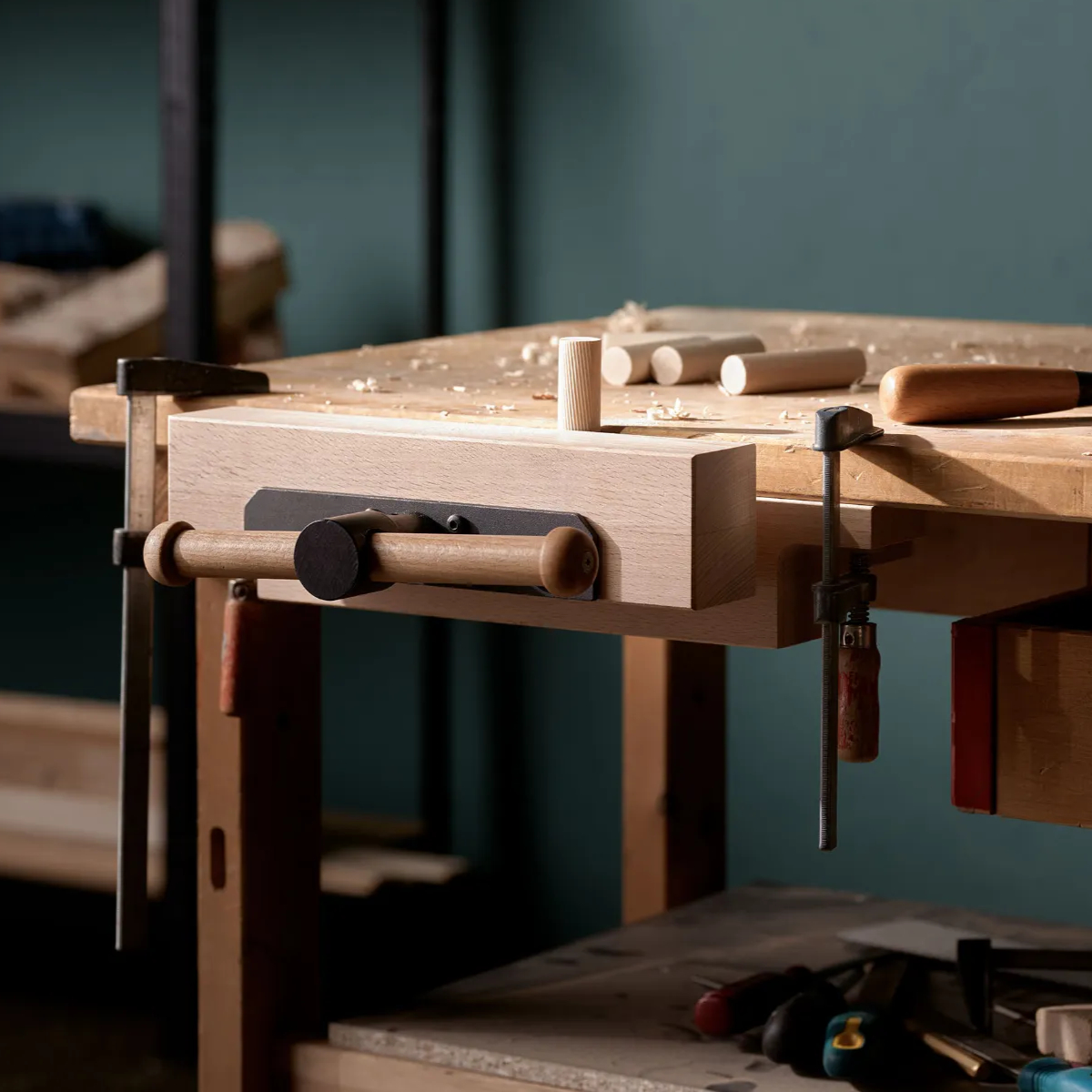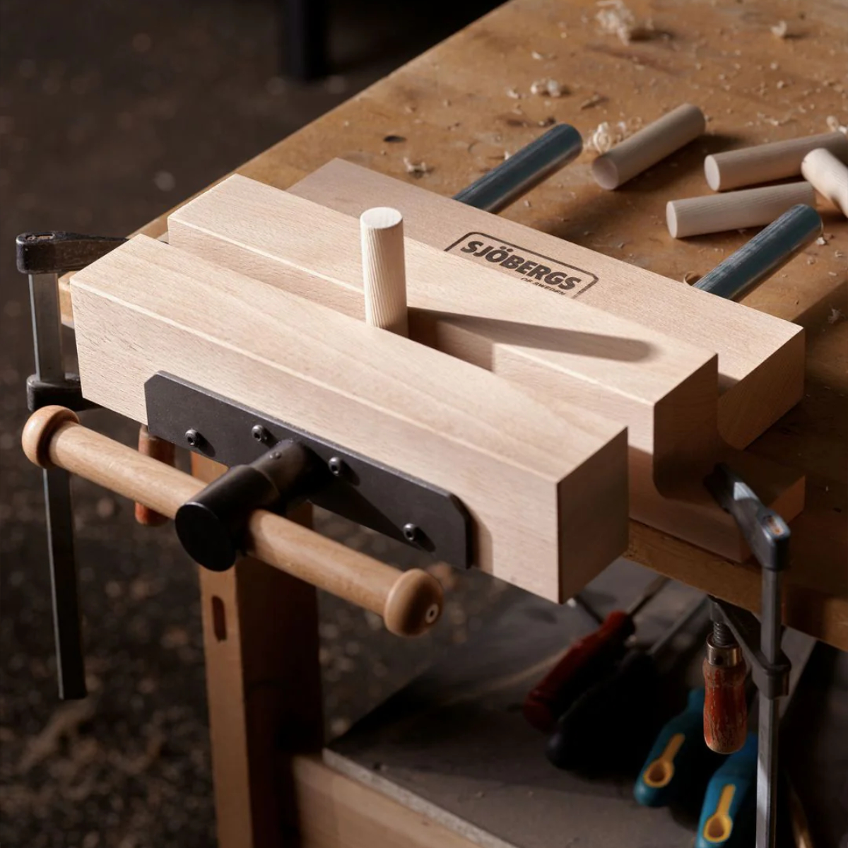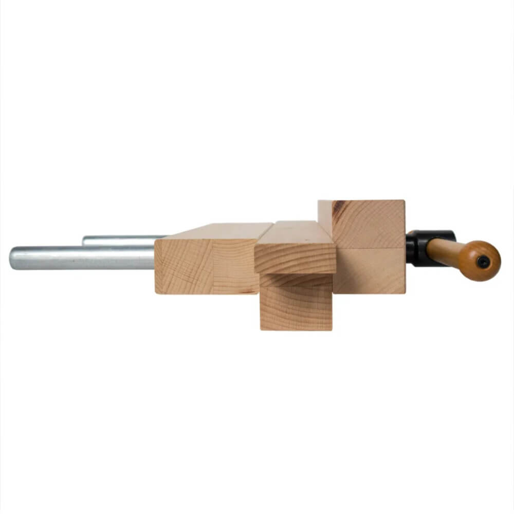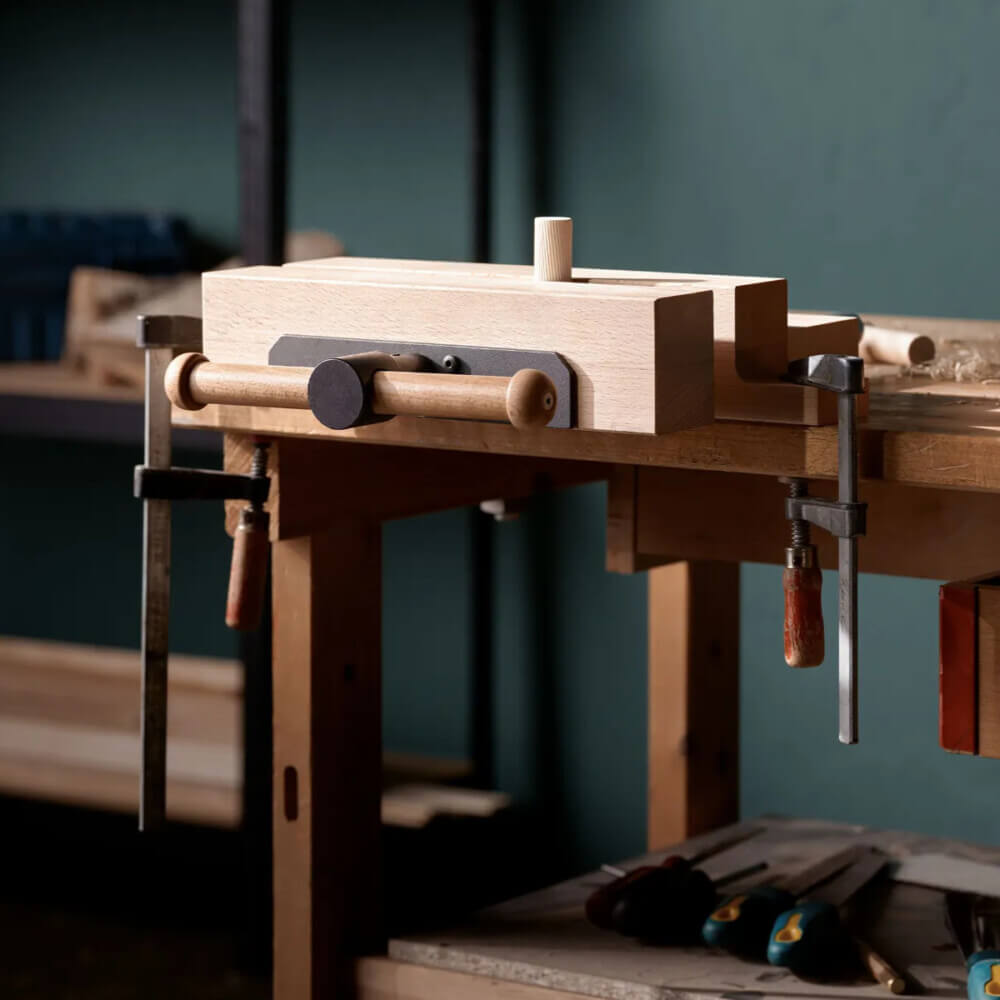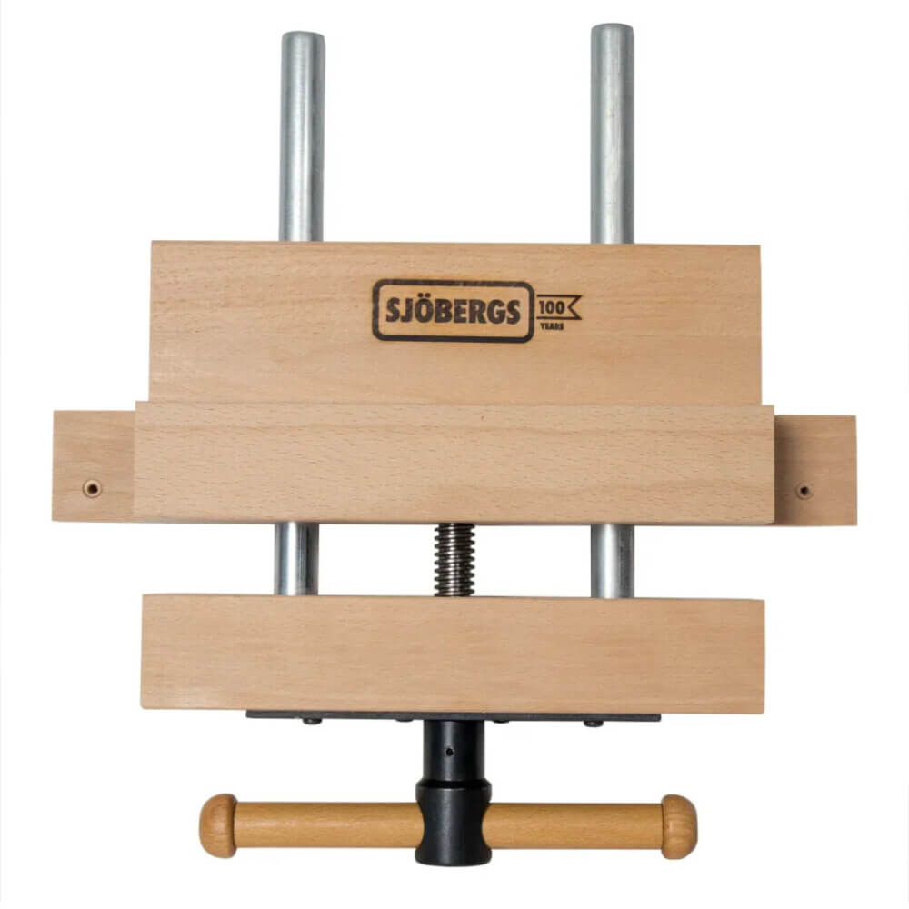 Nachrüstbare, tragbare Spannzange für Arbeiten im Atelier oder der Werkstatt. Eine schnelle Fixierung mit Zwingen ist möglich, alternativ kann die Spannzange auch an eine massive Tischplatte von oben oder unten geschraubt werden.