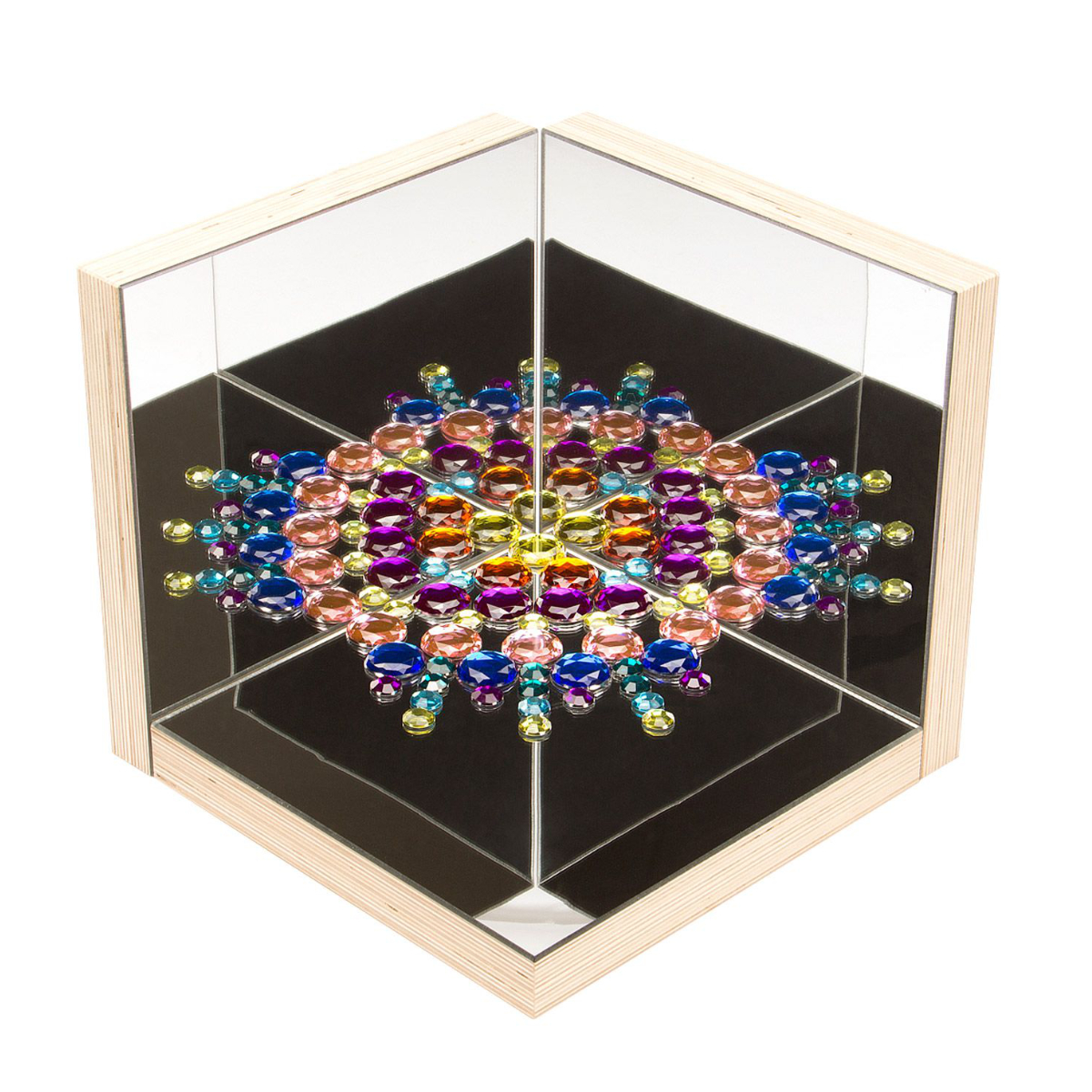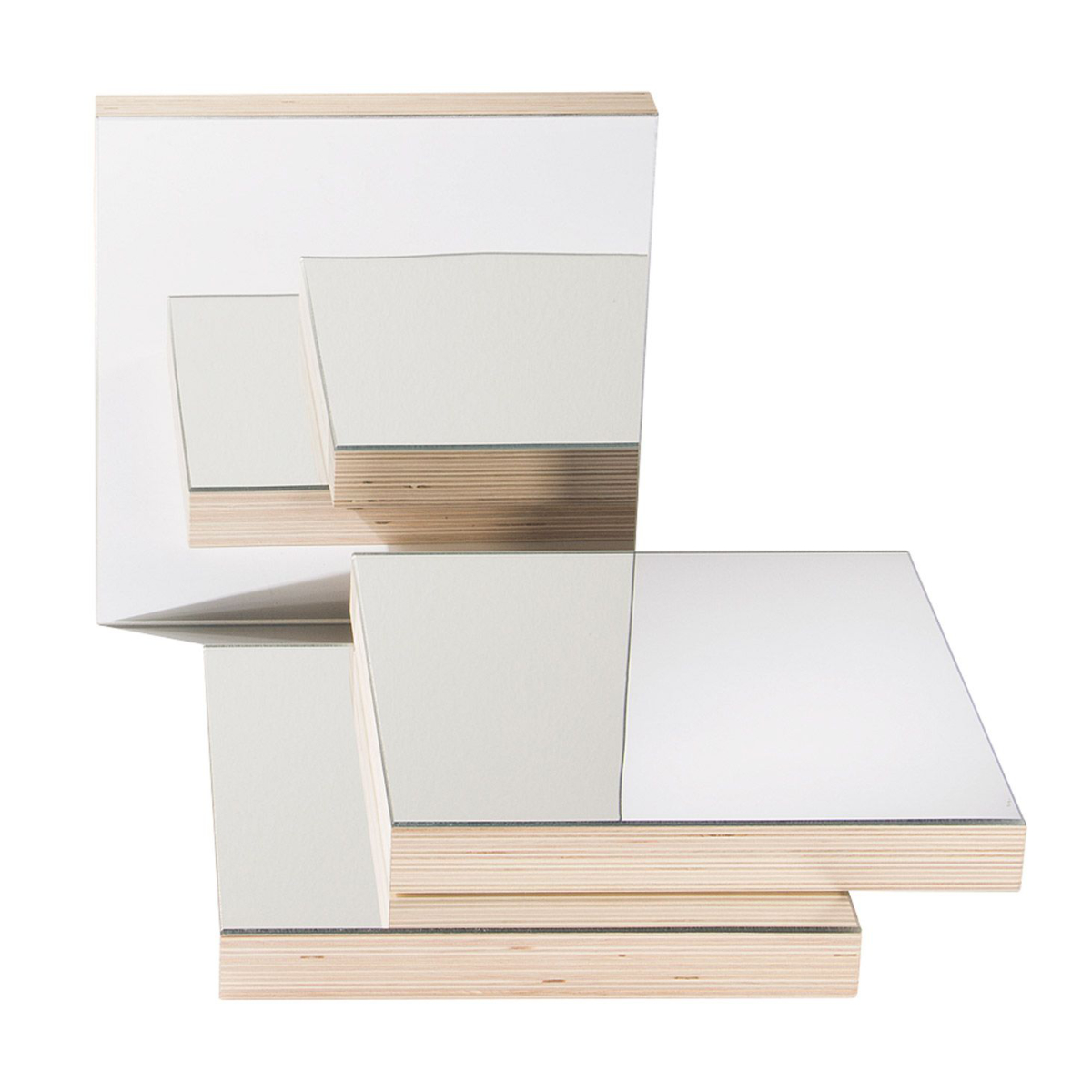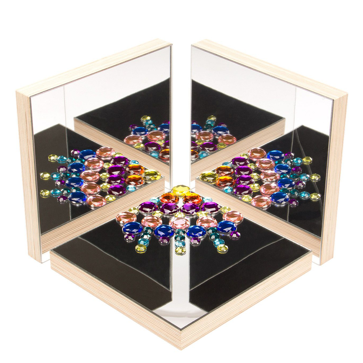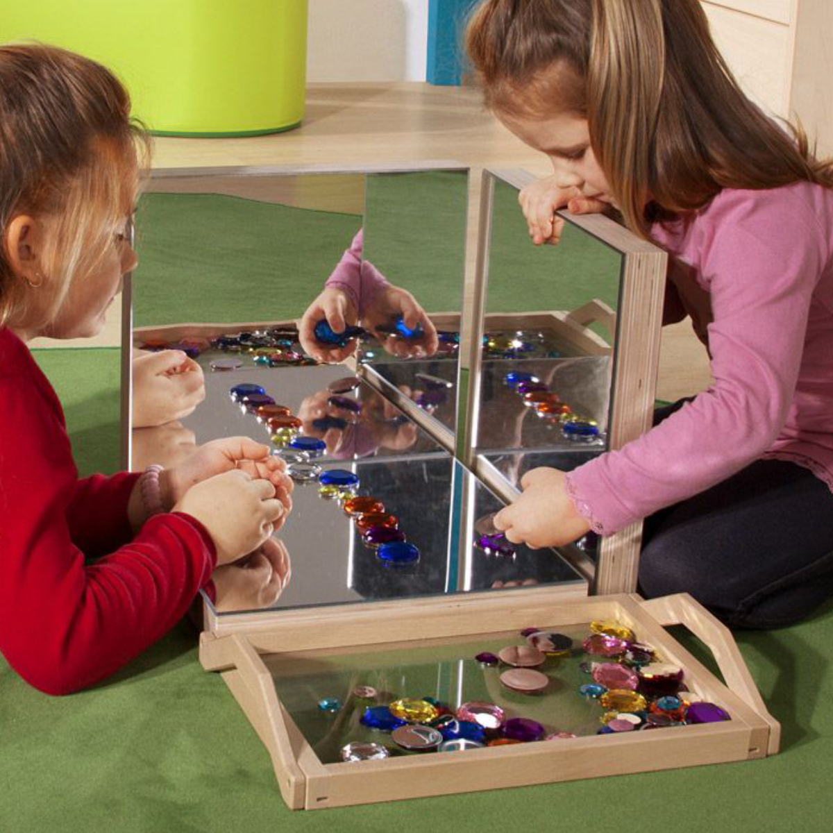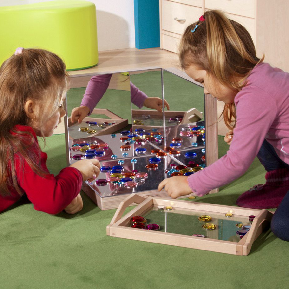 Zwei oder mehrere Spiegelplatten können im Winkel zueinander aufgestellt werden. Die Kinder haben so die Möglichkeit, Gegenstände oder sich selbst aus verschiedenen Perspektiven zu sehen. Durch Veränderung der Winkel ergeben sich immer neue Ansichten.