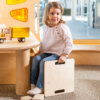 Unser Wendehocker Krippe verfügt über verschiedene Sitzhöhen, wobei bei der Drehung für die niedrigste Sitzhöhe jeweils eine Fußbank dafür sorgt, dass Kinder unterschiedlichen Alters an der gleichen Tischhöhe sitzen und gemeinsam essen können.