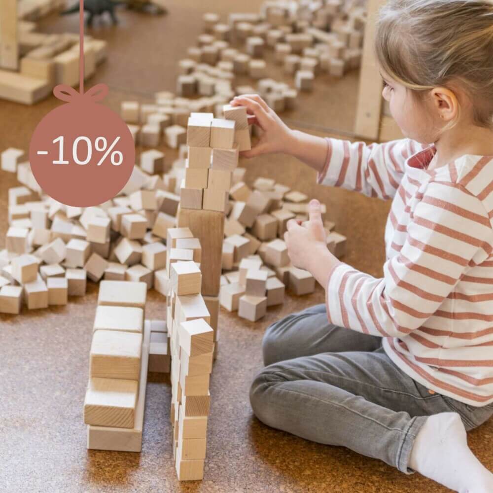 Das Arbeiten mit gleichem Material in großer Menge ermöglicht den Kindern entdeckende Lernprozesse im Feld der Mathematik. Durch den haptischen Reiz der großen Menge angeregt, beginnen sie mit eigenen Ideen und Tempo zu forschen und zu erfinden.
