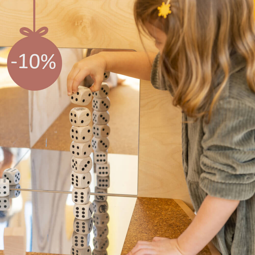Präzise gefertigte Würfel aus Ahorn, die hohes Aufstapeln zulassen. Für einprägsames Lernen sind die Augen im Detail sinnreich angeordnet und haptisch angenehm geprägt.